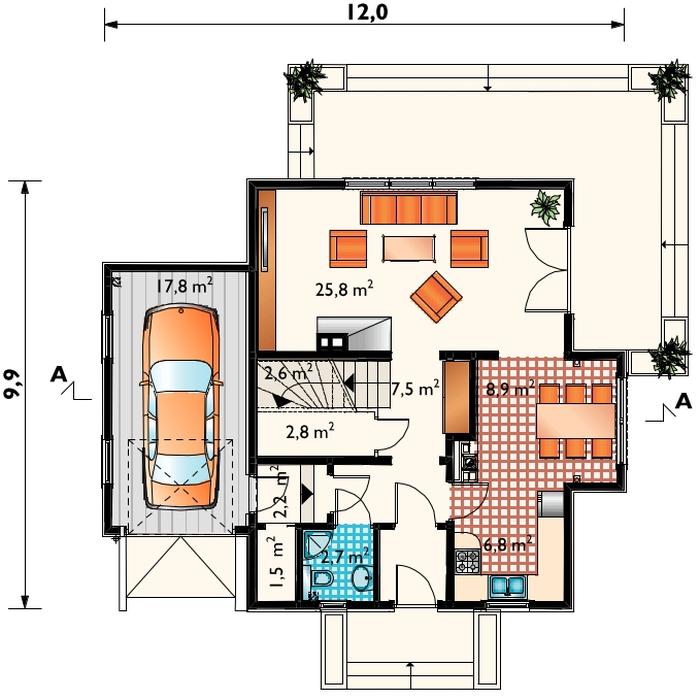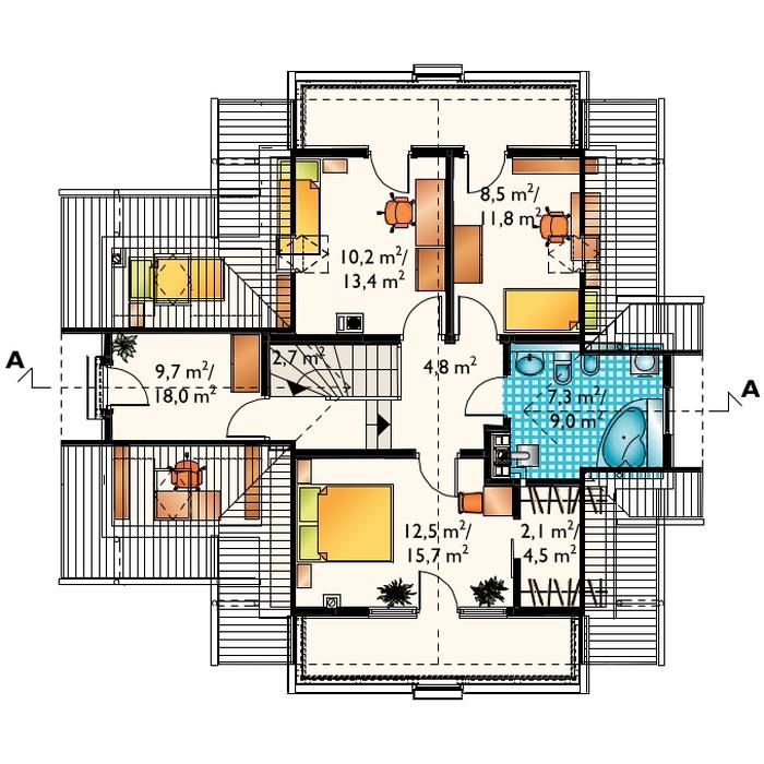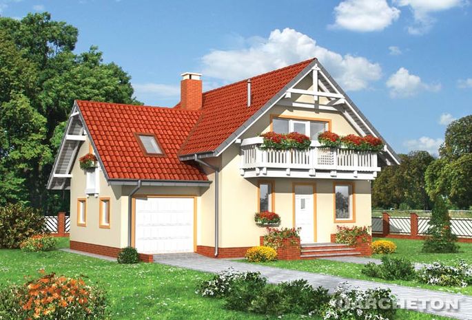 Dom parterowy, z użytkowym poddaszem, niepodpiwniczony, z garażemPrzez sień wchodzimy do holu. Na prawo dostępna jest kuchnia i jadalnia, na lewo - łazienka, z korytarza dostępny schowek i garaż. Na wprost idziemy do pokoju dziennego, mijając klatkę schodową prowadzącą na poddasze i schowek pod schodami. Z półpiętra dostępny jest pokój nad garażem. Na poddaszu znajdują się 3 pokoje, łazienka i garderoba. Stosunkowo niewielki, lecz przestronny dom przeznaczony dla 5-6 osobowej rodziny. Urozmaicona bryła z przenikającymi się dachami dwuspadowymi o kącie nachylenia połaci 40°, wzbogacona jest balkonami.Wersja technologiczna: szkielet drewniany prefabryk.Sciany zewnętrzne: szkieletowe drewniane z wypełnieniem wełną mineralną + styropian na zewnątrzSciany wewnętrzne: szkieletowe drewnianeStrop: drewnianyKonstrukcja dachu: drewniana, kleszczowo-płatwiowaRodzaj schodow: drewniane policzkowePokrycie dachu: blacha dachówkowa lub dachówka ceramicznaElewacje: tynk cienkowarstwowy na siatceTyp ogrzewania: kocioł na gaz