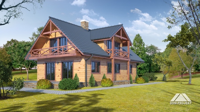 Wygodny dom z poddaszem użytkowym. Na parterze duża przestrzeń salonu, jadalni i kuchni. Zaprojektowano również pomieszczenie gospodarcze, kotłownię i dodatkowy pokój. Na poddaszu wszystkie pokoje z dostępem do balkonu, przestronny hol i dwie łazienki.