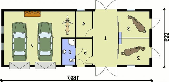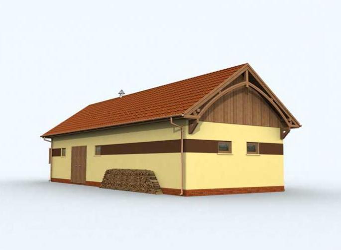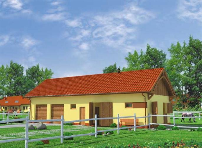 Niezwykle funkcjonalny projekt łączący w sobie zalety stajni i garażu. Miejsce dla koni zostało przewidziane z lewej strony budynku. Zwierzęta mogą wyjść na zewnątrz bezpośrednio z boksów, jak i komunikacją wewnątrz budynku. Bezpośrednio z komunikacji można także przejść do paszalni lub siodlarni, w której znajduje się wejście do łazienki zaopatrzonej w kabinę prysznicową. Drugą, wyodrębnioną część budynku stanowi obszerny garaż przeznaczony na dwa samochody, z miejscem na urządzenie warsztatu. Ten projekt będzie zatem przeznaczony dla osób pragnących posiadać dwustanowiskowy garaż połączony z dwoma boksami dla koni. Budynek będzie odpowiednim uzupełnieniem dla wygodnego domu.