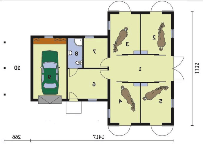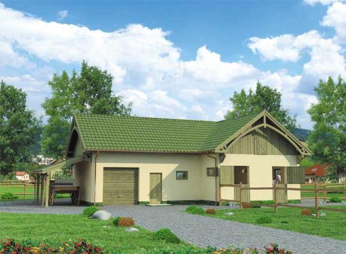 Projekt klasycznej stajni zbudowanej na planie odwróconej litery T. Główne wejście do stajni znajduje się przy zachodniej ścianie budynku i daje początek równie szerokiej komunikacji, wzdłuż której zostały ustawione naprzeciwko siebie wygodne boksy. Każdy z boksów został zaopatrzony w dodatkowe, bezpośrednie wyjście na zewnątrz. Warto zauważyć również, że w pobliżu boksów została przewidziana paszalnia. Do budynku można także wejść używając drzwi przewidzianych na południu. Prowadzą one do siodlarni, z której przechodzi się do łazienki lub do komunikacji. Ostatnim z pomieszczeń w tym budynku jest garaż z wjazdem od południa, usytuowany po wschodniej stronie budynku. Z tej strony przewidziano również niewielką wiatę. Nie jest to projekt pozwalający na rozwijanie hodowli, ale z pewnością zadowoli te osoby, które czują potrzebę posiadania własnych koni.