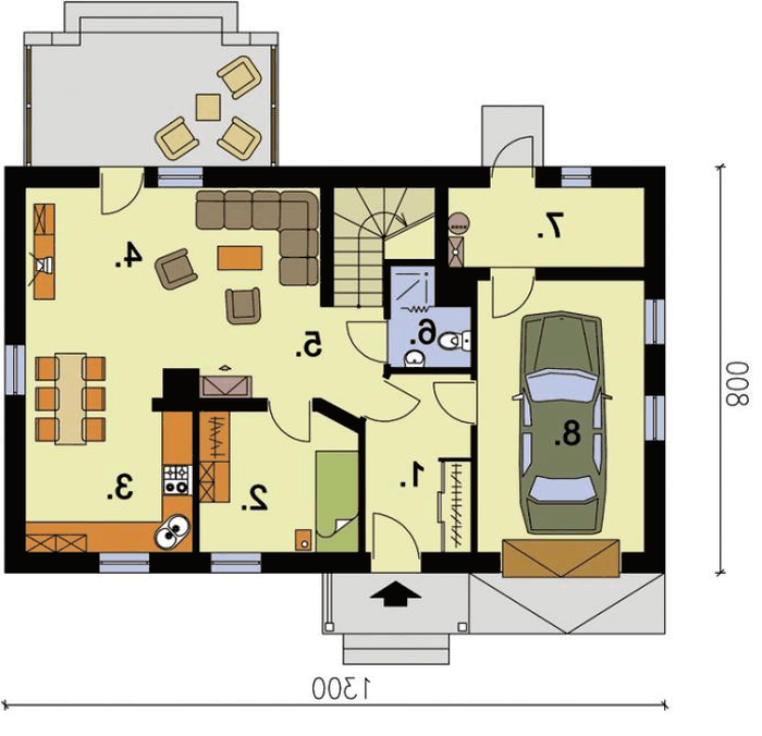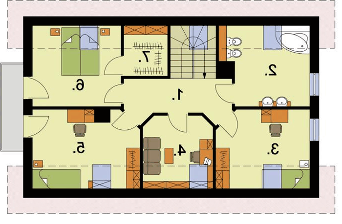 \"Lamia\" Projekt domku jednorodzinnego Lamia zachwyca swą prostotą i elegancją. Został zaprojektowany tak, by stanowić komfortowe rozwiązanie nawet dla pięcioosobowej rodziny. Wejście do domku zostało umieszczone pod niepozornym daszkiem, który stanowi przedłużenie dachu. Dwa okna wychodzące na południe, dodają elewacji frontowej wiele uroku. Z lewej strony przodu domu przewidziano jednostanowiskowy garaż. Na uwagę zasługuje fakt, iż w całym projekcie nacisk został położony na funkcjonalność całej konstrukcji opartej na prostej bryle. Wiatrołap, do którego wchodzimy po przekroczeniu progu domu, możemy zaopatrzyć w praktyczną garderobę. Stąd, kierując się na lewo, możemy przejść do jednostanowiskowego garażu, gdzie przewidziano miejsce na kotłownię, posiadającą odrębne wyjście na podwórze. Z wiatrołapu można także przejść do komunikacji spajającej pozostałe pomieszczenia parteru. Od razu po lewej stronie, tuż obok klatki schodowej przewidziano miejsce na niewielką łazienkę. Do ściany południowej domu przylega niewielki pokoik, który możemy urządzić zgodnie z potrzebami domowników (np. jako pokój telewizyjny, gabinet, czy sypialnię). Pozostałe trzy pomieszczenia parteru, mimo swej odrębności, stanowią wspaniały zespół, w którym znalazło się miejsce na kuchnię z aneksem jadalnym oraz na obszerny pokój dzienny. Możemy stąd udać się na przestronny, cichy taras, umieszczony z tyłu domu. Poddasze domu natomiast zajmuje ogromna łazienka z miejscem na wannę oraz cztery pokoje. Pierwszy z nich, sąsiadujący z łazienką, jest oświetlany przez dwa okna – tradycyjne i połaciowe. Drugi – niewielki – posiada tylko okno połaciowe. Pozostałe dwa pokoje, oprócz okien połaciowych, mają także wyjście na balkon umieszczony od strony wschodniej domu. Sypialnia, przylegająca do ścian północnej i wschodniej, została dodatkowo wyposażona w garderobę. W projekcie Lamia wykorzystano zatem wiele ciekawych rozwiązań. Jest komfortowym, jednorodzinnym domem. Czyż ten projekt nie jest wart uwagi? Projekt składa się z części architektonicznej, konstrukcyjnej, wewnętrznych instalacji wod.-kan, c. o. , gaz. i elektrycznej. W projekcie załączone są podstawowe zestawienie stali, drewna i stolarki okienno-drzwiowej. Do projektu dołączamy bezpłatną zgodę na wprowadzenie zmian, oświadczenie projektantów o wykonaniu projektu zgodnie z obowiązującymi normami i przepisami oraz kserokopie uprawnień projektantów wraz z aktualnym wpisem do izby. W przypadku zamówienia projektu w technologii lekkiej, drewnianej konstrukcji szkieletowej, powierzchnia użytkowa budynku jest o około 7% większa.