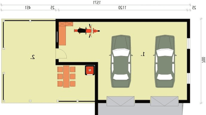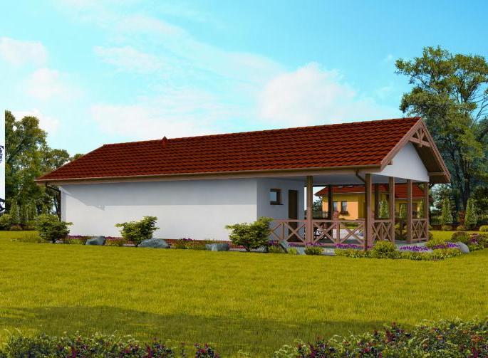 Garaż parterowy dwustanowiskowy z zadaszonym tarasem. Bramy garażowe o wymiarach otworu w murze 2400x2400. PROJEKT DOSTĘPNY RÓWNIEŻ W WERSJI Z SPADEM DACHU 25 STOPNI. Projekt składa się z części architektonicznej, konstrukcyjnej i wewnętrznej instalacji elektrycznej. W projekcie załączone są podstawowe zestawienie stali, drewna i stolarki okienno-drzwiowej. Do projektu dołączamy bezpłatną zgodę na wprowadzenie zmian, oświadczenie projektantów o wykonaniu projektu zgodnie z obowiązującymi normami i przepisami oraz kserokopie uprawnień projektantów wraz z aktualnym wpisem do izby. W przypadku zamówienia projektu w technologii lekkiej, drewnianej konstrukcji szkieletowej, powierzchnia użytkowa budynku jest o około 7% większa.