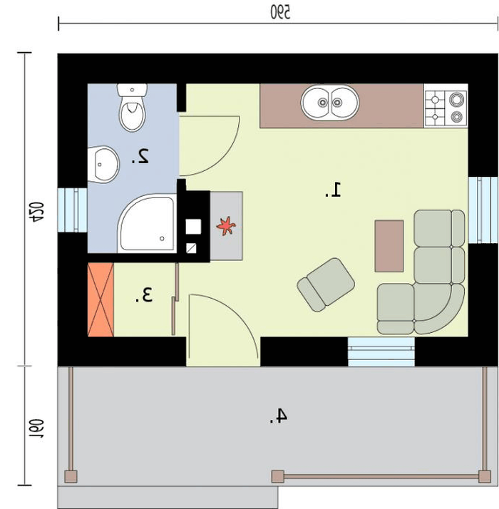 | 1. | Pokój dzienny z aneksem kuchennym | 12,55 m2 |