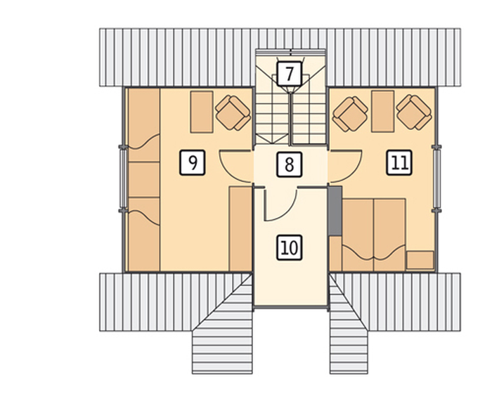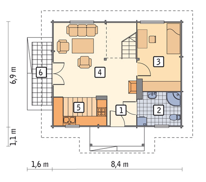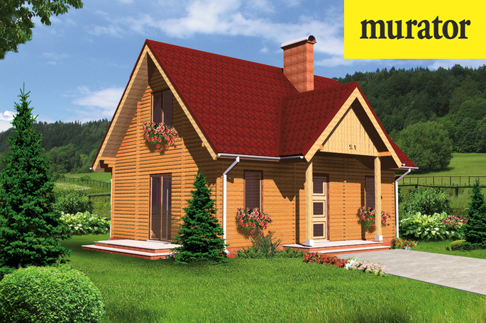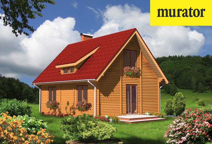 Mieszkanie w domu drewnianym kojarzy się z relaksem i życiem w zgodzie z naturą. Projekt będzie pasował na leśne i podmiejskie działki. Prosty, dwuspadowy dach z lukarną doświetlającą poddasze to tradycyjny element architektoniczny. Projektując wnętrze nacisk położono przede wszystkim na jak najbardziej efektywne wykorzystanie przestrzeni. Część dzienna na parterze jest otwarta, co jest dobrym rozwiązaniem, szczególnie w małych domach. Pomieszczenia wydają się bardziej przestronne. W projekcie kuchnia, salon i hol tworzą harmonijną całość. Na parterze wygospodarowano także miejsce na oddzielny pokój, który może pełnić funkcję sypialni oraz łazienkę blisko wejścia. Dwie sypialnie zaprojektowano także na poddaszu.