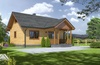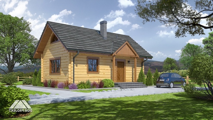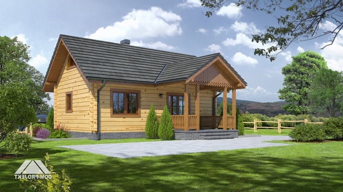 Mały dom parterowy –konstrukcja drewniana z bali. Dom mieszkalny lub letniskowy. 2 pokoje, aneks kuchenny, łazienka, wiatrołap, duży zadaszony taras. W salonie kominek i schody składane na poddasze (możliwość wykorzystania poddasza na cele gospodarcze lub dodatkowe spanie w lecie). Dom łatwy i tani w budowie i tani w eksploatacji.