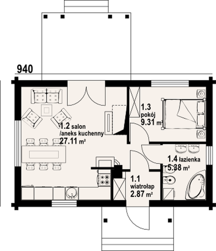 | 1.2 | salon z aneksem kuchennym | 27,11 m2 |