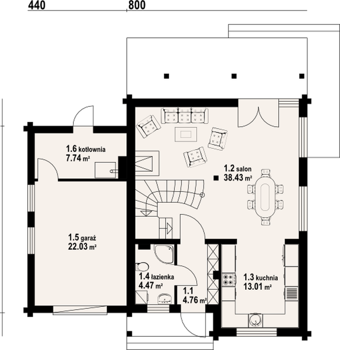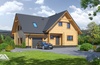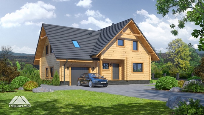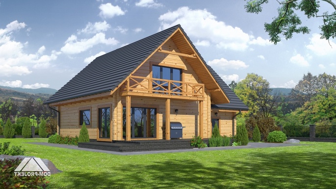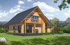Funkcjonalny dom z użytkowym poddaszem. Na parterze duży salon z kominkiem, połączony z kuchnią. Schody z salonu prowadzą na poddasze, gdzie znajdują się trzy sypialnie, pokój rekreacyjny i łazienka. Dobudowana cześć gospodarcza mieści garaż i kotłownię.