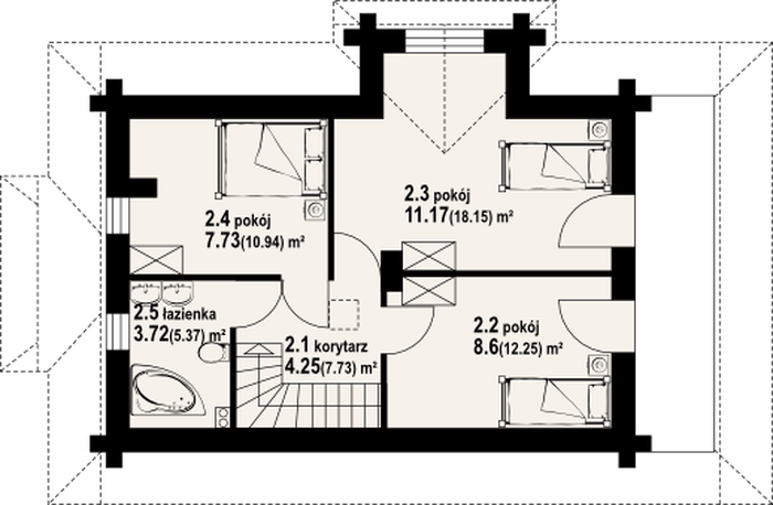 Dom o ciekawej architekturze. Parter to strefa dzienna, w której zaprojektowano salon z aneksem kuchennym oraz miejscem na jadalnię w ozdobnym wykuszu. Ponadto na parterze znajdują się pomieszczenia łazienki i kotłowni. W strefie nocnej zlokalizowanej na poddaszu przewidziano trzy sypialnie, w tym dwie z wyjściem na balkon i łazienkę. Dom doskonale nadaje się do usytuowania na wąskiej działce.