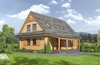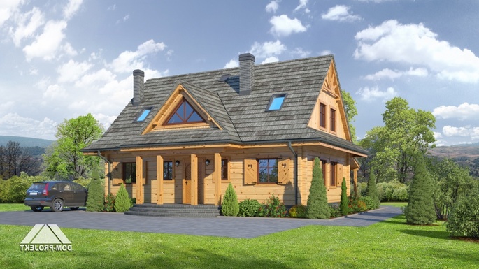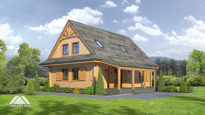 Dom z bali drewnianych. Duży salon z aneksem kuchennym, kominkiem, wyjściem na taras i schodami na poddasze. Pokój, łazienka, wiatrołap, kotłownia, spiżarka. Na poddaszu trzy pokoje, łazienka i komunikacja. Zwarta bryła budynku i dwuspadowy dach korzystnie wpływają na koszty budowy i koszty eksploatacji.