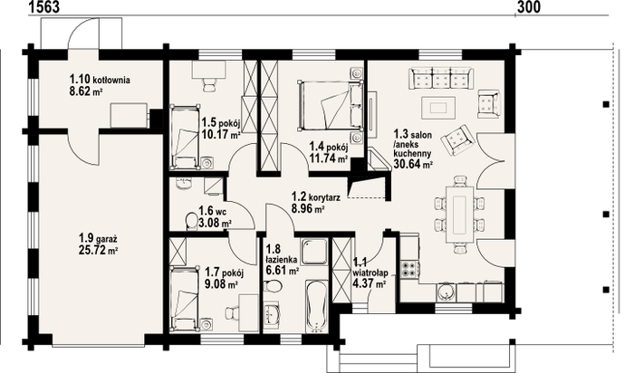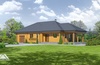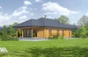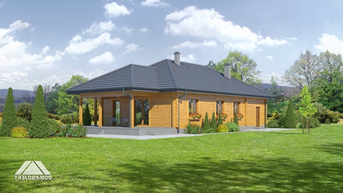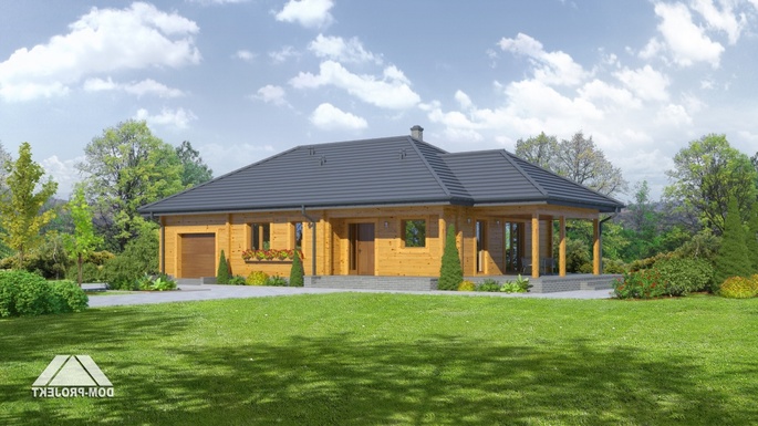Dom parterowy z bali. Duży salon z aneksem kuchennym, kominkiem i wyjściem na zadaszony taras. Trzy pokoje, łazienka, wc, korytarz i wiatrołap. W korytarzu schody rozkładane na strych. Garaż, kotłownia.