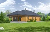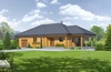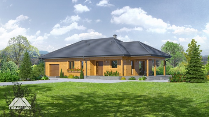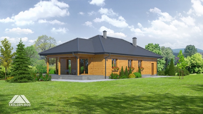 Dom parterowy w konstrukcji szkieletu drewnianego. Duży salon z aneksem kuchennym, kominkiem i wyjściem na zadaszony taras. Trzy pokoje, łazienka, wc z pralką, korytarz i wiatrołap. W korytarzu schody rozkładane na strych. Strych nieużytkowy. Garaż i kotłownia.
