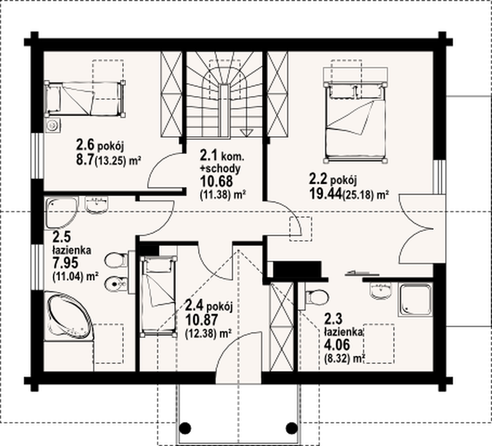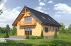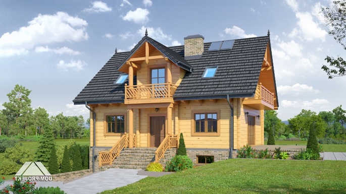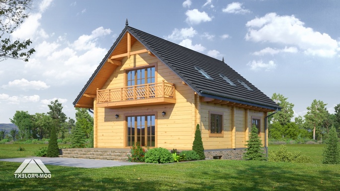 Podpiwniczony dom z bali drewnianych. Piwnice murowane, parter i poddasze z bali. Duży salon z aneksem kuchennym, kominkiem, wyjściem na taras i schodami na poddasze. Dwa pokoje, łazienka i wiatrołap. Na poddaszu trzy pokoje, dwie łazienki , dwa balkony i komunikacja. W piwnicach garaż, kotłownia i pomieszczenia piwnic. Zwarta bryła budynku i dach dwuspadowy.
