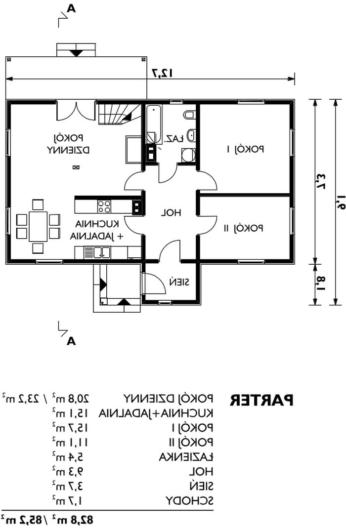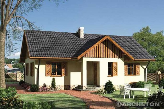 Dom parterowy, z częściowo użytkowym poddaszem, niepodpiwniczony. Uwaga! Projekt dostępny wyłącznie w wersji katalogowej.Budynek jest obiektem parterowym. Strefa dzienna obejmuje pokój dzienny z antresolą, kuchnię z jadalnią, sień oraz hol wejściowy. Strefa nocna, dostępna z holu mieści 2 pokoje sypialne i łazienkę. Niewielkie poddasze dostępne schodami z pokoju dziennego mieści strych i antresolę. Główną bryłę budynku tworzy wydłużony prostopadłościan przykryty dachem dwuspadowym o kącie nachylenia 36°. W ścianach szczytowych umieszczono kwadratowe okna ustawione przekątnie, doświetlające dodatkowo antresolę oraz strych. Prostą bryłę wzbogacają dwa podcienia na słupach, prowadzące do wejścia i na taras.Wersja technologiczna: szkielet drewniany lekkiSciany zewnętrzne: Szkielet drewniany. Izolacja produktami Knauf Insulation. Okładziny z płyt cementowych Aquapanel Outdoor firmy KNAUFSciany wewnętrzne: Szkielet drewniany. Izolacja produktami Knauf Insulation. Okładziny z płyt gipsowo-włóknowych Vidiwall gr. 12,5 mm firmy KNAUFStrop: Drewniany. Izolacja produktami Knauf Insulation. Konstrukcja dachu: drewniana, krokwiowo-płatwiowaRodzaj schodow: drewniane firmy RINTALPokrycie dachu: dachówka ceramiczna firmy RUPPCERAMIKAElewacje: tynk cienkowarstwowy oraz okładziny z betonowego kamienia elewacyjnego RELIEFTyp ogrzewania: kocioł na gaz
