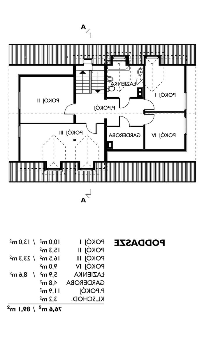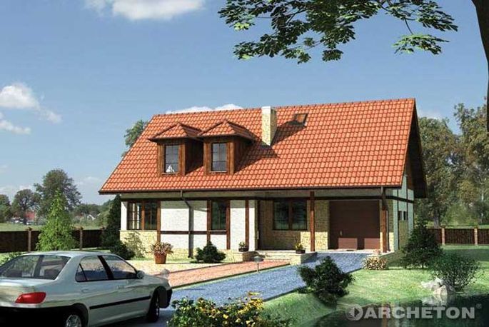 Dom parterowy, z użytkowym poddaszem, niepodpiwniczony, z garażem. Uwaga! Projekt dostępny wyłącznie w wersji katalogowej.Wejście z podcienia poprzez wiatrołap oraz sień bezpośrednio do pokoju dziennego, skąd są dostępne również: na lewo kuchnia z jadalnią oraz w.c., a na prawo gabinet. Z podcienia dostajemy się do garażu z pomieszczeniem gospodarczym. Na poddaszu usytuowano 4 pokoje sypialne, garderobę oraz łazienkę. Bryłę budynku tworzy prostopadłościan nakryty dachem dwuspadowym o kącie nachylenia 40°. Prostą bryłę urozmaicają podcienia wejścia i wyjścia na taras. Bryłę wzbogacają również drewniane listwy mocowane do muru, które imitują mur pruski.Wersja technologiczna: szkielet drewniany lekkiSciany zewnętrzne: Szkielet drewniany. Izolacja produktami Knauf Insulation. Okładziny z płyt cementowych Aquapanel Outdoor firmy KNAUFSciany wewnętrzne: Szkielet drewniany. Izolacja produktami Knauf Insulation. Okładziny z płyt gipsowo-włóknowych Vidiwall gr. 12,5 mm firmy KNAUFStrop: Drewniany. Izolacja produktami Knauf Insulation.Konstrukcja dachu: drewniana, jętkowaRodzaj schodow: drewniane firmy RINTALPokrycie dachu: dachówka ceramiczna firmy RUPPCERAMIKAElewacje: tynk cienkowarstwowy oraz okładziny z betonowego kamienia elewacyjnego RELIEFTyp ogrzewania: kocioł na gaz