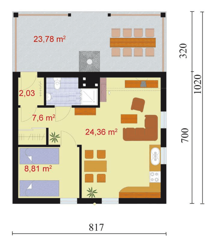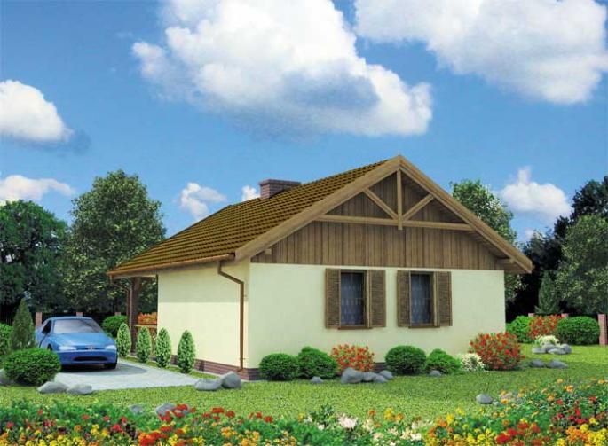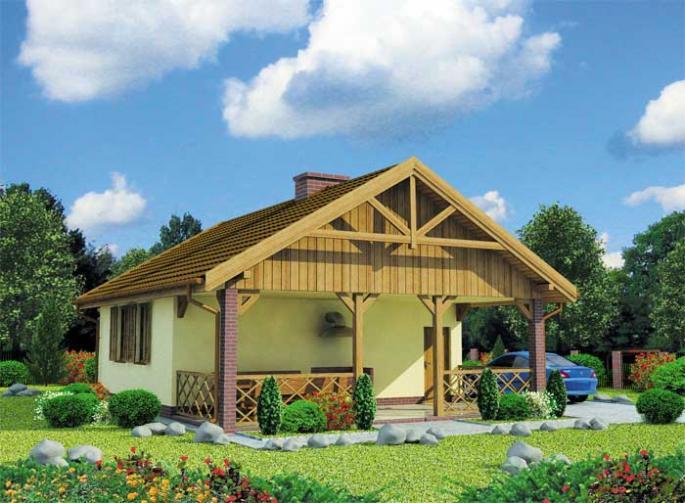 To niewielki domek letniskowy, w którym delikatny dodatek elewacji frontowej stanowi cegła wkomponowana w taras jako zewnętrzne kolumny oraz grill, na którym przyrządzonych zostanie wiele przysmaków. Sielski klimat na zewnątrz budynku wprowadza nas do funkcjonalnego wnętrza, które odsłania całą tajemnicę tego jak powinny zostać zagospodarowane pomieszczenia o małej powierzchni, aby odczuwać komfort płynący z otwartej przestrzeni. Rozwiązanie to zostało zastosowane w pokoju dziennym, w skład którego wchodzą salon, kuchnia i jadalnia. Połączone razem zapewnią stały kontakt między wczasowiczami! Oprócz tego efektownego pomieszczenia w domku znajdziemy również garderobę, łazienkę oraz sypialnię.