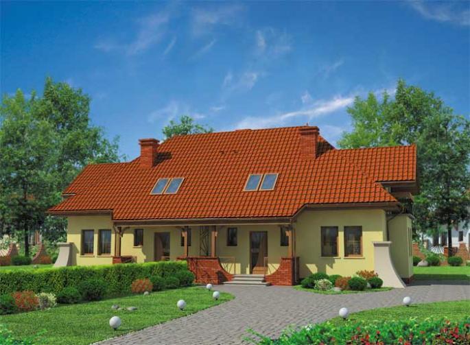 To ciekawy projekt obszernego domu bliźniaczego, jednak niepodpiwniczonego oraz nie posiadającego możliwości adaptacji kotłowni na węgiel. Na szczególną uwagę zasługuje elewacja frontowa domu, gdzie pod niewielkim zadaszeniem, znajduje się wejście, otoczone murkiem z czerwonej cegły, współgrającej kolorystycznie z dachem pokrytym dachówką ceramiczną. Elewacja tylna posiada wysokie okna, nadające jej nietuzinkowego wyglądu. Z boku domu widoczny jest wykusz, stanowiący ciekawy element konstrukcyjny, dający możliwość stworzenia balkonu, na który wychodzi się z pokoju na poddaszu.