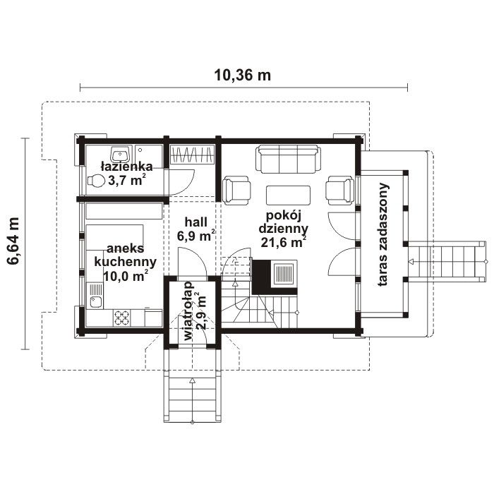 | pow. zabudowy | 63,90m2 | wys. pomieszczeń | 2,60m | wymiary budynku | 10,36m x 6,64m |