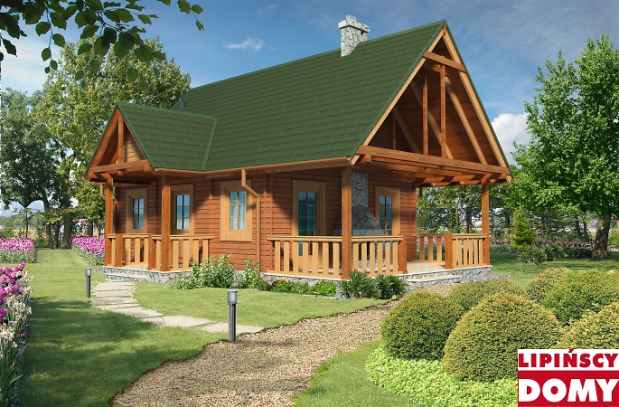 Lahti (LMWD03): Dom weekendowy parterowy z poddaszem użytkowym, 2 pokoje: jedna sypialnia. Romantyczny, niewielki domek letniskowy z bala drewnianego, prosty i tani w realizacji. Wejście do domu zaakcentowane jest poprzez zadaszony ganek. Na parterze jest pokój rekreacyjny z kominkiem i wyjściem na taras, aneks kuchenny i łazienka. Usytuowanie kominka pozwala na jego użytkowanie wewnątrz i na zewnątrz domu. Duży zadaszony taras przy pokoju rekreacyjnym, daje cień i osłania przed deszczem.