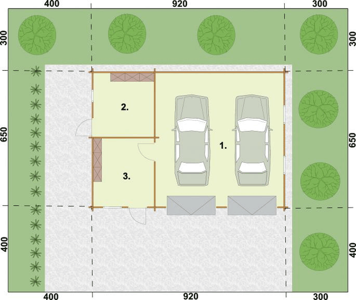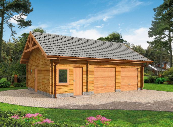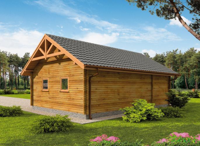 Projekt z bala drewnianego garażu dwustanowiskowego z 2 pom. gospodarczymi.