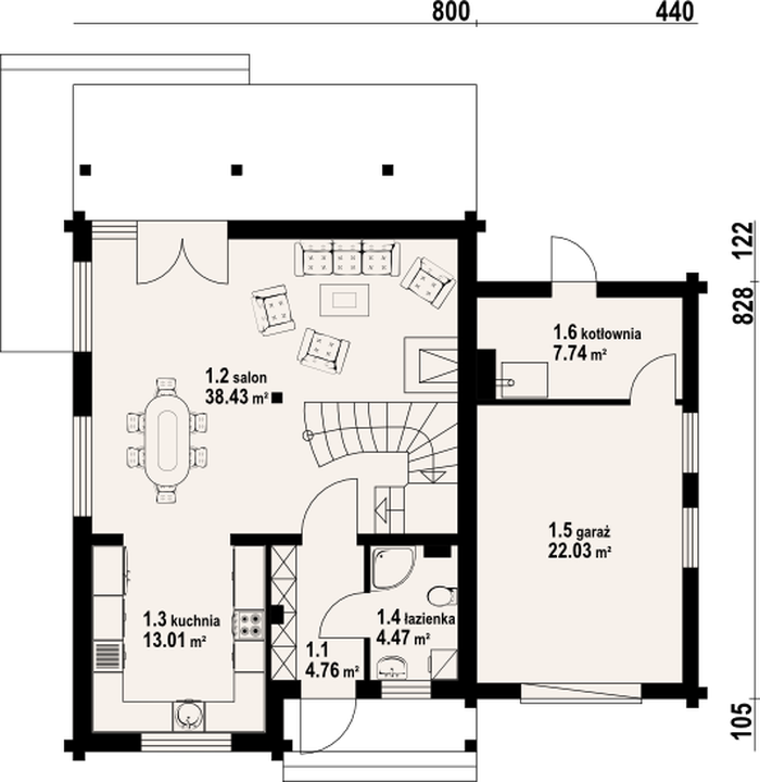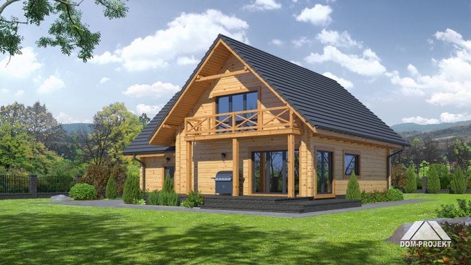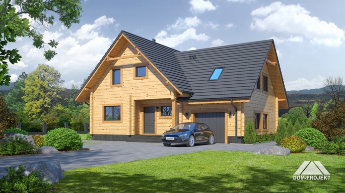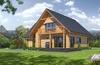 Funkcjonalny dom z użytkowym poddaszem. Na parterze duży salon z kominkiem, połączony z kuchnią. Schody z salonu prowadzą na poddasze, gdzie znajdują się trzy sypialnie, pokój rekreacyjny i łazienka. Dobudowana cześć gospodarcza mieści garaż i kotłownię.