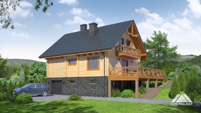W pełni podpiwniczony dom z poddaszem użytkowym. Na parterze salon z aneksem kuchennym, kominkiem i wyjściem na duży taras. Ponadto dwa pokoje i łazienka. Trzy sypialnie, w tym dwie z wyjściem na balkon i duża łazienka na poddaszu. W piwnicy zaplecze gospodarcze oraz garaż. Dom idealny do usytuowania na działkach ze spadkiem terenu.