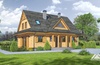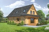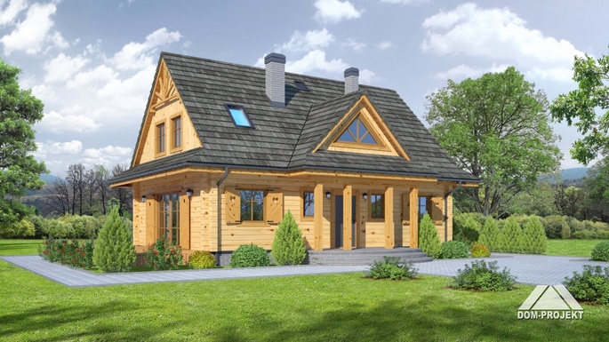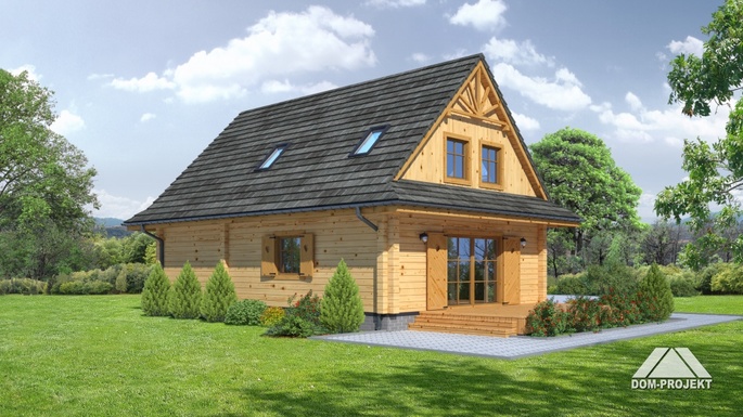Dom z bali drewnianych. Na parterze salon z częściowo otwartą kuchnią, wyjściem na taras, kominkiem i schodami na poddasze, pokój - biblioteka, wiatrołap, wc/ pralnia, spiżarka i kotłownia. Na poddaszu trzy pokoje, dwie garderoby oraz łazienka.