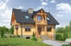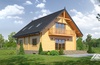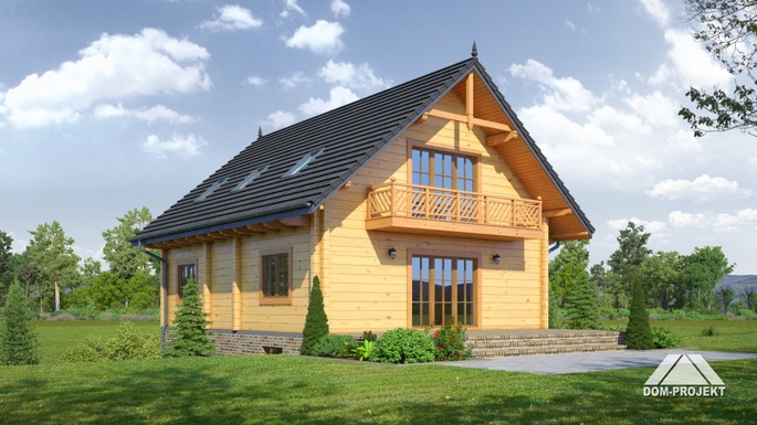 Podpiwniczony dom z bali drewnianych. Piwnice murowane, parter i poddasze z bali. Duży salon z aneksem kuchennym, kominkiem, wyjściem na taras i schodami na poddasze. Dwa pokoje, łazienka i wiatrołap. Na poddaszu trzy pokoje, dwie łazienki , dwa balkony i komunikacja. W piwnicach garaż, kotłownia i pomieszczenia piwnic. Zwarta bryła budynku i dach dwuspadowy.