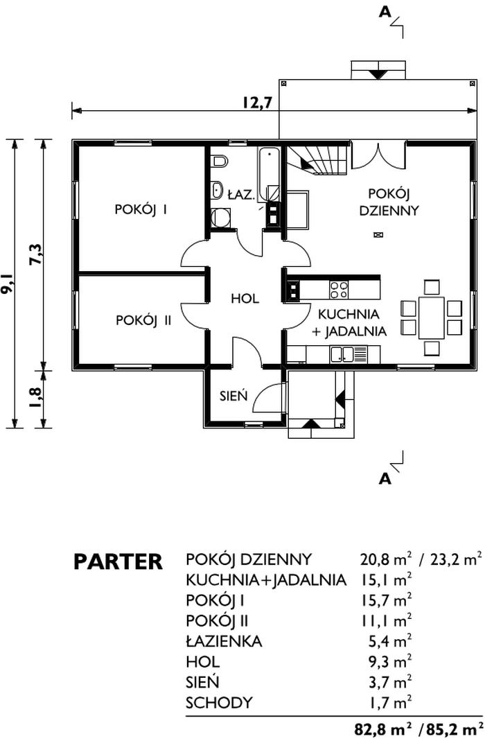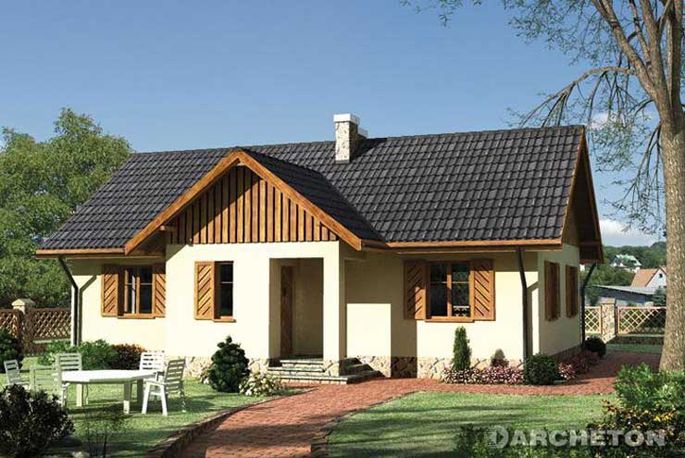 Dom parterowy, z częściowo użytkowym poddaszem, niepodpiwniczony. Uwaga! Projekt dostępny wyłącznie w wersji katalogowej.Budynek jest obiektem parterowym. Strefa dzienna obejmuje pokój dzienny z antresolą, kuchnię z jadalnią, sień oraz hol wejściowy. Strefa nocna, dostępna z holu mieści 2 pokoje sypialne i łazienkę. Niewielkie poddasze dostępne schodami z pokoju dziennego mieści strych i antresolę. Główną bryłę budynku tworzy wydłużony prostopadłościan przykryty dachem dwuspadowym o kącie nachylenia 36°. W ścianach szczytowych umieszczono kwadratowe okna ustawione przekątnie, doświetlające dodatkowo antresolę oraz strych. Prostą bryłę wzbogacają dwa podcienia na słupach, prowadzące do wejścia i na taras.Wersja technologiczna: szkielet drewniany lekkiSciany zewnętrzne: Szkielet drewniany. Izolacja produktami Knauf Insulation. Okładziny z płyt cementowych Aquapanel Outdoor firmy KNAUFSciany wewnętrzne: Szkielet drewniany. Izolacja produktami Knauf Insulation. Okładziny z płyt gipsowo-włóknowych Vidiwall gr. 12,5 mm firmy KNAUFStrop: Drewniany. Izolacja produktami Knauf Insulation. Konstrukcja dachu: drewniana, krokwiowo-płatwiowaRodzaj schodow: drewniane firmy RINTALPokrycie dachu: dachówka ceramiczna firmy RUPPCERAMIKAElewacje: tynk cienkowarstwowy oraz okładziny z betonowego kamienia elewacyjnego RELIEFTyp ogrzewania: kocioł na gaz