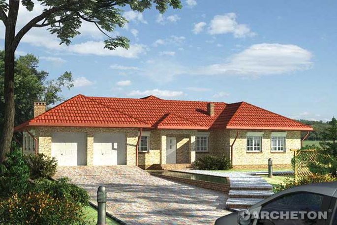 Dom parterowy, niepodpiwniczony, z garażem na 2 samochody. Uwaga! Projekt dostępny wyłącznie w wersji katalogowej.W układzie funkcjonalnym budynku wyodrębnić można trzy strefy: dzienną, nocną i gospodarczą. Strefa dzienna obejmuje pokój dzienny, kuchnię, jadalnię, pokój, sień wejściową oraz hol. Strefa nocna, dostępna z holu, mieści 3 pokoje sypialne i 2 łazienki. W części gospodarczej zlokalizowano garaż dwustanowiskowy, kotłownię i pomieszczenie gospodarcze. Bryłę budnyku tworzą trzy zestawione ze sobą prostopadłościany przykryte dachami wielospadowymi o kącie nachylenia połaci 30°. Rozbudowaną bryłę wzbogacają dwa podcienia: wejściowy oraz wyjścia na taras.Wersja technologiczna: szkielet drewniany lekkiSciany zewnętrzne: Szkielet drewniany. Izolacja produktami Knauf Insulation. Okładziny z płyt cementowych Aquapanel Outdoor firmy KNAUFSciany wewnętrzne: Szkielet drewniany. Izolacja produktami Knauf Insulation. Okładziny z płyt gipsowo-włóknowych Vidiwall gr. 12,5 mm firmy KNAUFStrop: Drewniany. Izolacja produktami Knauf Insulation.Konstrukcja dachu: wiązary drewnianeRodzaj schodow: Pokrycie dachu: dachówka ceramiczna - Imerys Toiture (www.imerys-rooftiles.com)Elewacje: tynk cienkowarstwowy oraz okładziny z betonowego kamienia elewacyjnego RELIEFTyp ogrzewania: kocioł na gaz