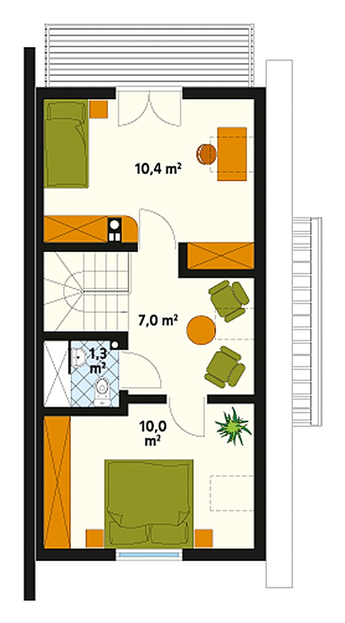 Budynek jednorodzinny z użytkowym poddaszem przeznaczony dla 3 – 4-osobowej rodziny. Typowy projekt na wąską działkę. Budynek ma ścianę przeciwpożarową, przez co można go postawić po granicy działki. Na parterze znajduje się salon z aneksem kuchennym, pokój i łazienka. Na poddaszu zaprojektowano dwa pokoje i wc.