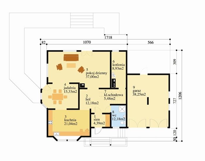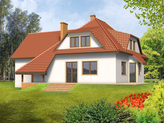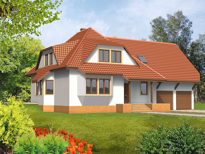 Dom parterowy z poddaszem użytkowym i garażem na dwa samochody zaprojektowano dla rodzi-ny 4 - 5-cio osobowej. Dom podzielony jest na dwie strefy, dzienną w której znajduje się na parte-rze hol, pokój dzienny, kuchnia, jadalnia, kotłownia i wc oraz strefa nocna na poddaszu 4 sypial-nie z łazienką.